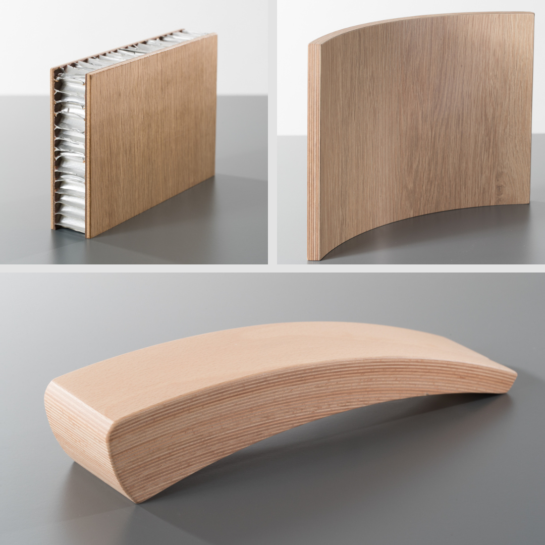 Selon les projets, plusieurs solutions peuvent être envisagées : multiplis, contreplaqué, lamellé-collé, panneaux techniques, panneaux nid d’abeille , matériaux allégés et autres matériaux bois adaptés à une application spécifique.